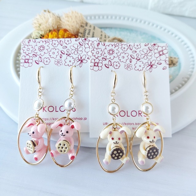 ビスケットを持った可愛いウサギちゃんが耳元で揺れるピアス・イヤリングです。 ウサギチャームは後ろ姿も可愛いチャームになっています。 オフホワイトとピンクのウサギからお好みのウサギをお選び下さい。 画像のフックピアスタイプとサージカルステンレスネジバネイヤリングでお作りできます。 全長(ピアス金具抜きで):約50mm 。ウサギちゃんの身長:約20mm大。 フックピアス金具はメッキを使用。 ネジバネイヤリング金具はサージカルステンレス316(SUS)使用。 【お手入れ方法】 金属は金メッキのため、空気や水分、塩分に触れない場所での保管をお勧めします。 アクセサリーボックスや封のできる袋などに入れて保管するとより長くお使いいただけます。 メッキ部部は水分に弱いので、なるべく水分に触れないようにし、使用後は乾いた布でやさしくふき取ってください。 研磨剤などを含む布を使用しますと、表面のメッキごと取ってしまうことになりますので、 アクセサリー専用布やめがね拭きなどの繊維の細かいものを使用するのがおすすめです。 毎日身に着けたいお気に入りのアクセサリー、ぜひ正しいお手入れ方法で長持ちさせて頂ければ幸いです。