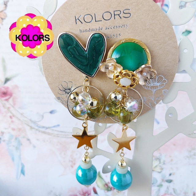 【グリーンハート ピアス・イヤリング】 心躍るグリーンカラーのハートが大ぶりで存在感のあるピアスイヤリングです。アシンメトリーなデザインがおしゃれ。揺れるガラスビーズが女性らしい優雅さを演出します。 アレルギー対応の素材を使用しているため、長時間つけていても安心です。大ぶりのサイズ感は、カジュアルコーデからパーティースタイルまで幅広く合わせることができます。自分へのご褒美に、また大切な方へのギフトにもぴったりです。 毎日のコーディネートに彩りを加える一品として、ぜひお手元に置いていただきたいです。季節や気分に合わせて、1つ、2つとコレクションを増やしてみてください。心躍るグリーンのハートが、あなたを幸せな気持ちに包み込みますように。 全長:約89mm 。ハートボタン:約28×25mm大。 【サージカルステンレス316(SUS)とは】 ピアス・イヤリング金具はサージカルステンレス316(SUS)使用しています。 ステンレスの中でもアレルギー性の極めて低い素材です。 金アレ対応のため、敏感なお肌の方でも腫れない、痒くならない、かぶれない、赤くならないなど 安心してご使用になれます。錆びにくく変色しにくい特性もあります。 (金属アレルギーには個人差がございます。全ての方がアレルギー反応が出ないことを保証するものではございませんのでご注意ください。) 【お手入れ方法】 ボタンは柔らかい布で汚れや油分、塩分を拭き取って下さい。 金属は金メッキのため、空気や水分、塩分に触れない場所での保管をお勧めします。 アクセサリーボックスや封のできる袋などに入れて保管するとより長くお使いいただけます。 メッキ部部は水分に弱いので、なるべく水分に触れないようにし、使用後は乾いた布でやさしくふき取ってください。 研磨剤などを含む布を使用しますと、表面のメッキごと取ってしまうことになりますので、 アクセサリー専用布やめがね拭きなどの繊維の細かいものを使用するのがおすすめです。 毎日身に着けたいお気に入りのアクセサリー、ぜひ正しいお手入れ方法で長持ちさせて頂ければ幸いです。 【その他】 ☆ピアス・イヤリングは汗水に強くて錆びにくくお肌にも優しい素材のサージカルステンレス製となっております。金属アレルギーには個人差がございます。全ての方がアレルギー反応が出ないことを保証するものではございませんのでご注意ください。 ☆ピアスは重みで下に下がらず綺麗に見えるように下向き防止キャッチをおつけします。 ☆使用しているボタンは海外のヴィンテージボタンを含むため小傷や汚れ等があるものもあります。ヴィンテージ特有の味わいなのでご理解のうご購入下さい。 ☆レジンをたっぷり使用してますのでレジンアレルギーの方はご注意下さい。