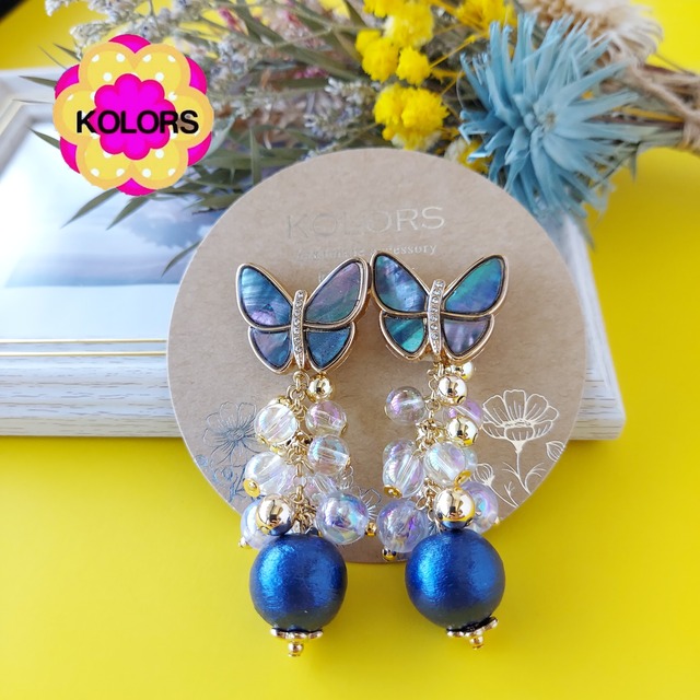 【ピアス or イヤリング 変更可】【ブルー蝶とジャラジャラコットンパール ピアス・イヤリング】揺れるピアス/ 揺れるイヤリング/レディース 揺れる / アレルギー対応/大ぶりピアス/大ぶりイヤリング/チョウ/バタフライ