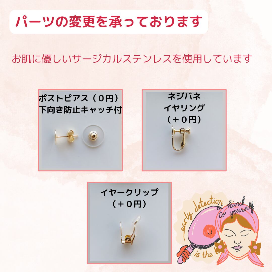 金具にはサージカルステンレスを使用しており、金属アレルギーが気になる方にも安心してお使いいただけます。また、ピアス金具はイヤリングへの変更も可能ですので、どんな方にもお楽しみいただけます。