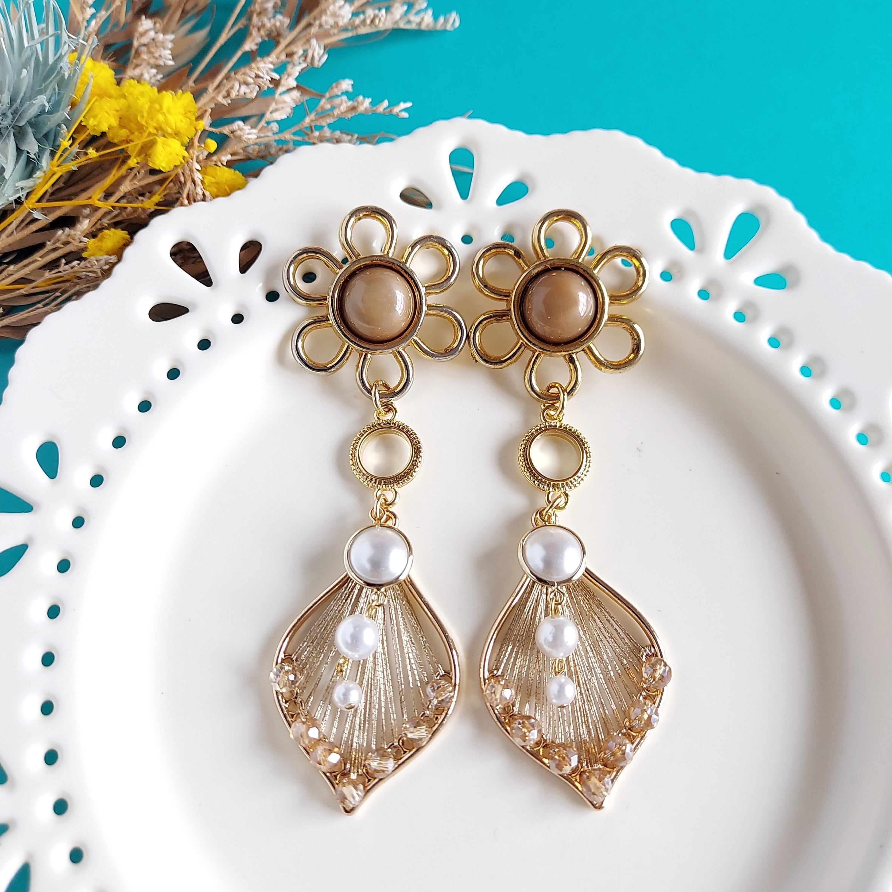 【春の訪れを耳元に。お花ボタンの大ぶりピアス・イヤリング(ベージュ)】