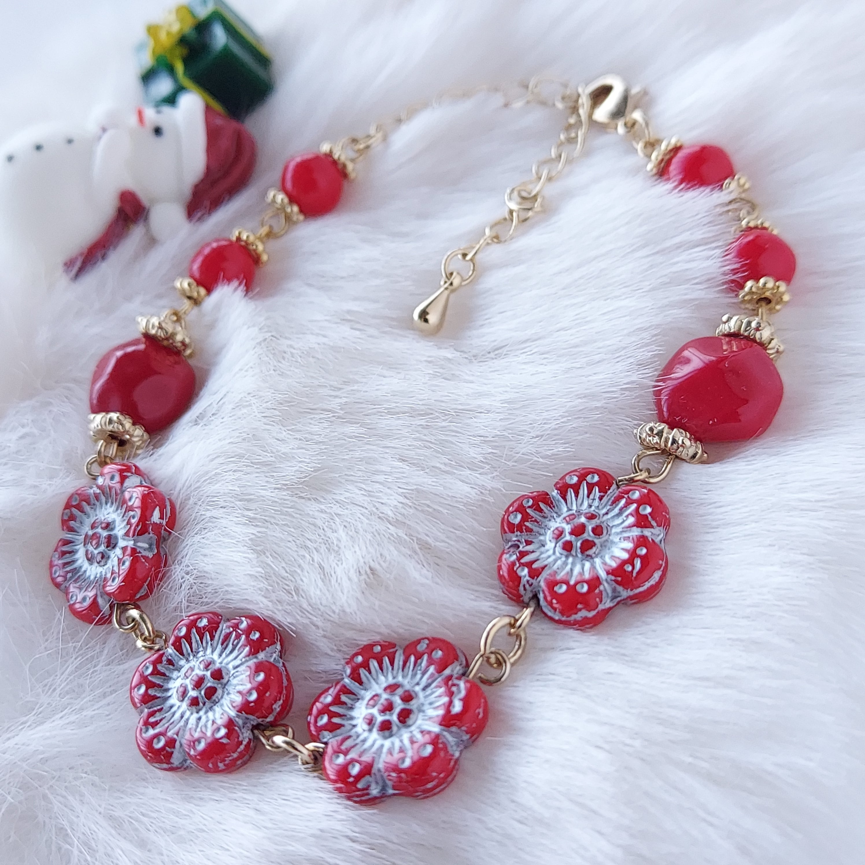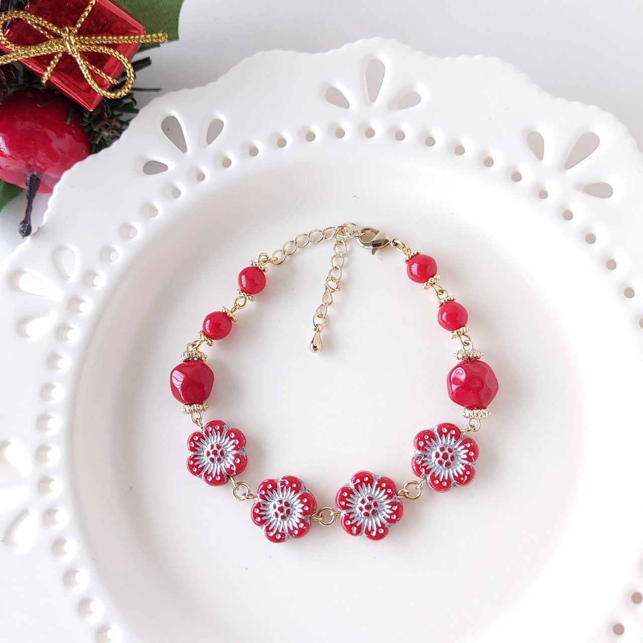 冬の煌めきを手首に纏う『クリスマスカラーのブレスレット』で、日常に特別なアクセントを加えませんか?このブレスレットは、お花の形をした赤のチェコビーズでデザインされており、クリスマスカラーの鮮やかな赤が印象的です。ビーズの光沢が優しく光を反射し、まるで冬の夜空に輝く星のように手元を美しく飾ります。