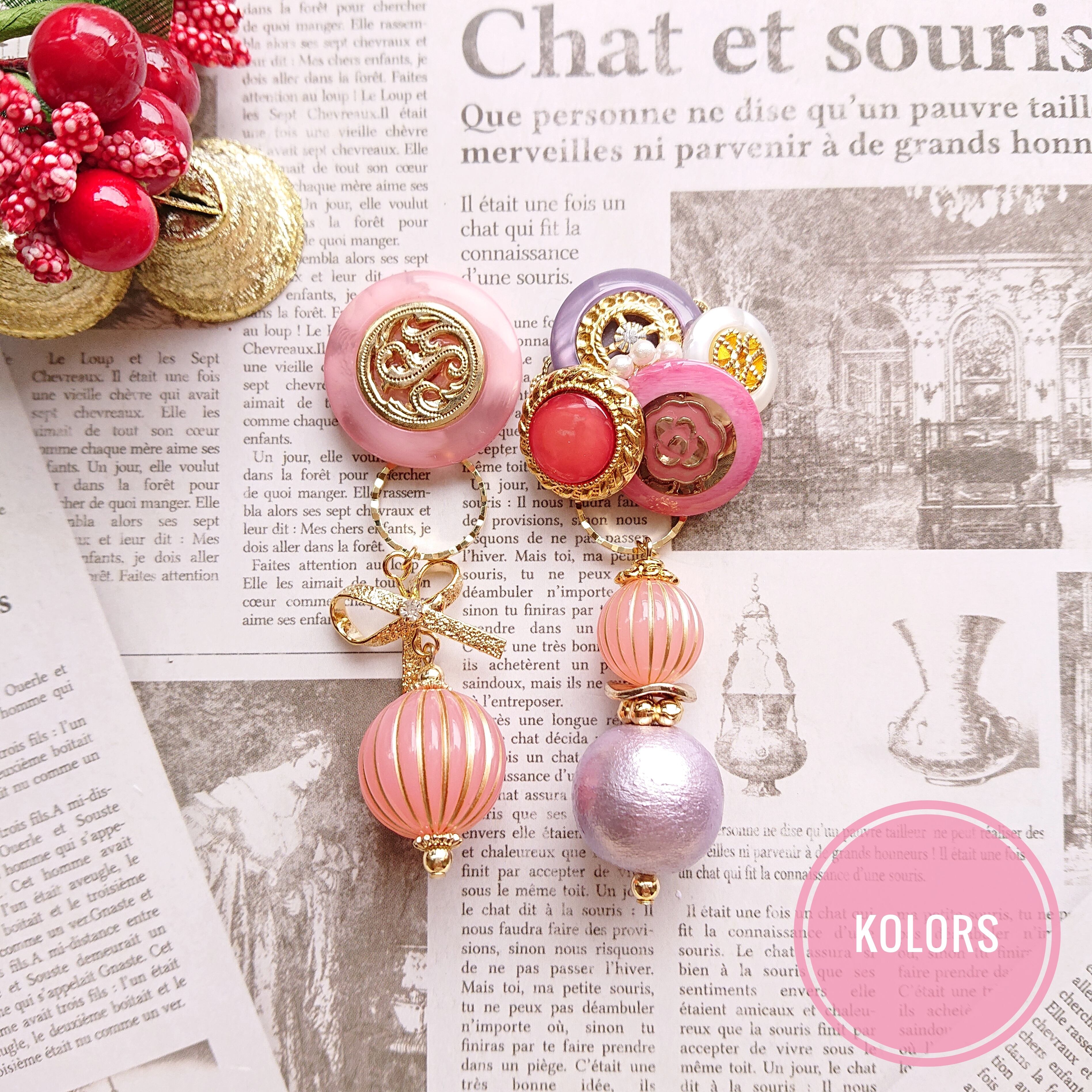 ぶら下がり部分は、ゴールドラインが可愛いサイズ違いのピンクビーズ、パープルのコットンパール、シュガー加工した冬にぴったりのメタルリボンをユラユラさせたクリスマスシーズンに着けたいピアス・イヤリングです。