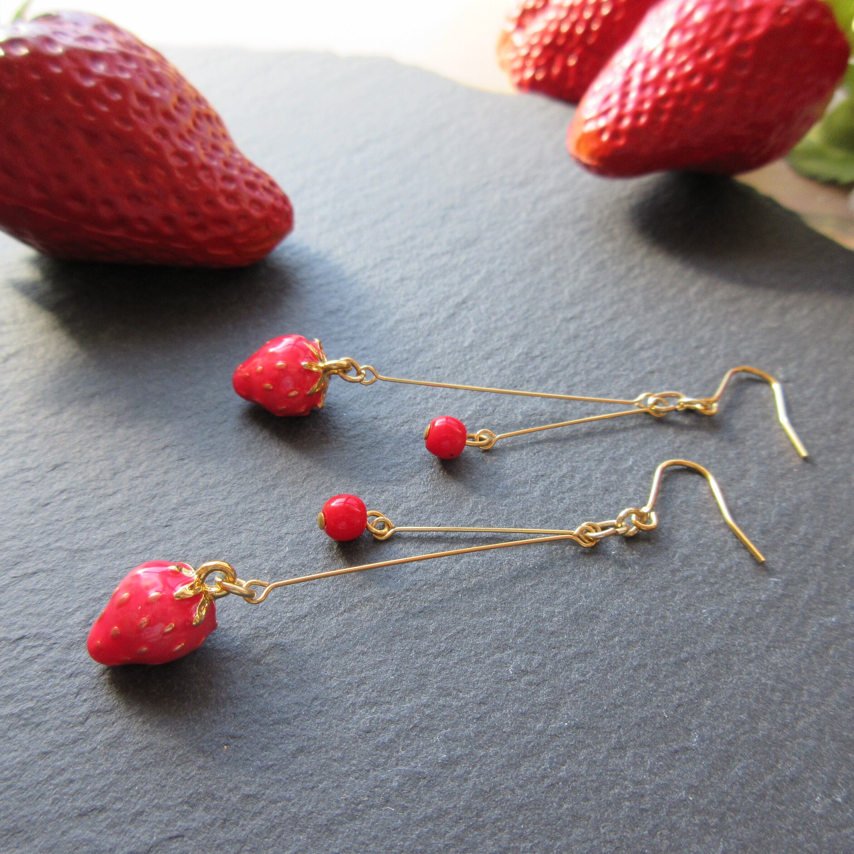 キュートなイチゴチャームとフランスの真っ赤なビーズがワイヤーとともにユラユラ揺れるキュートなピアス・イヤリングです。 お揃いのネックレスと合わせてのイチゴコーデがおススメ
