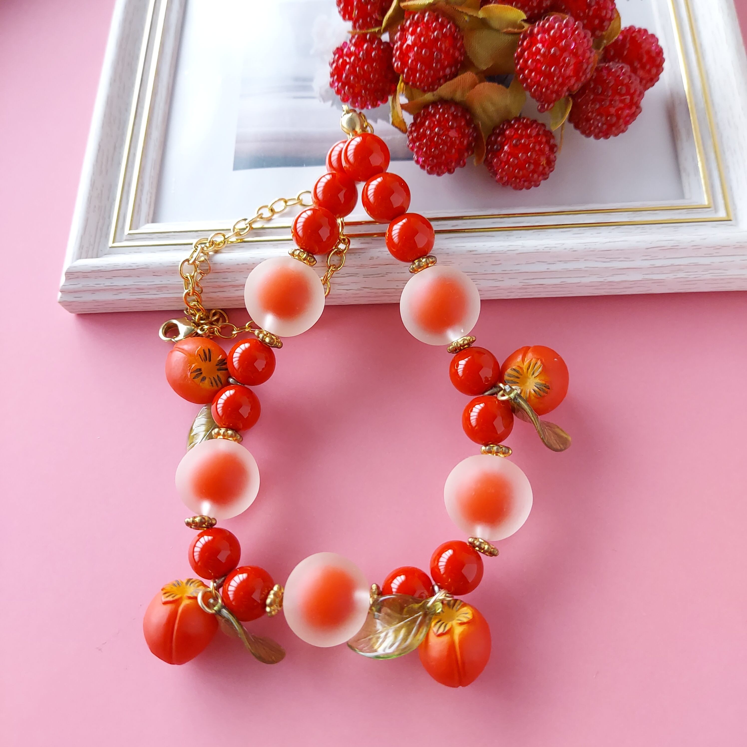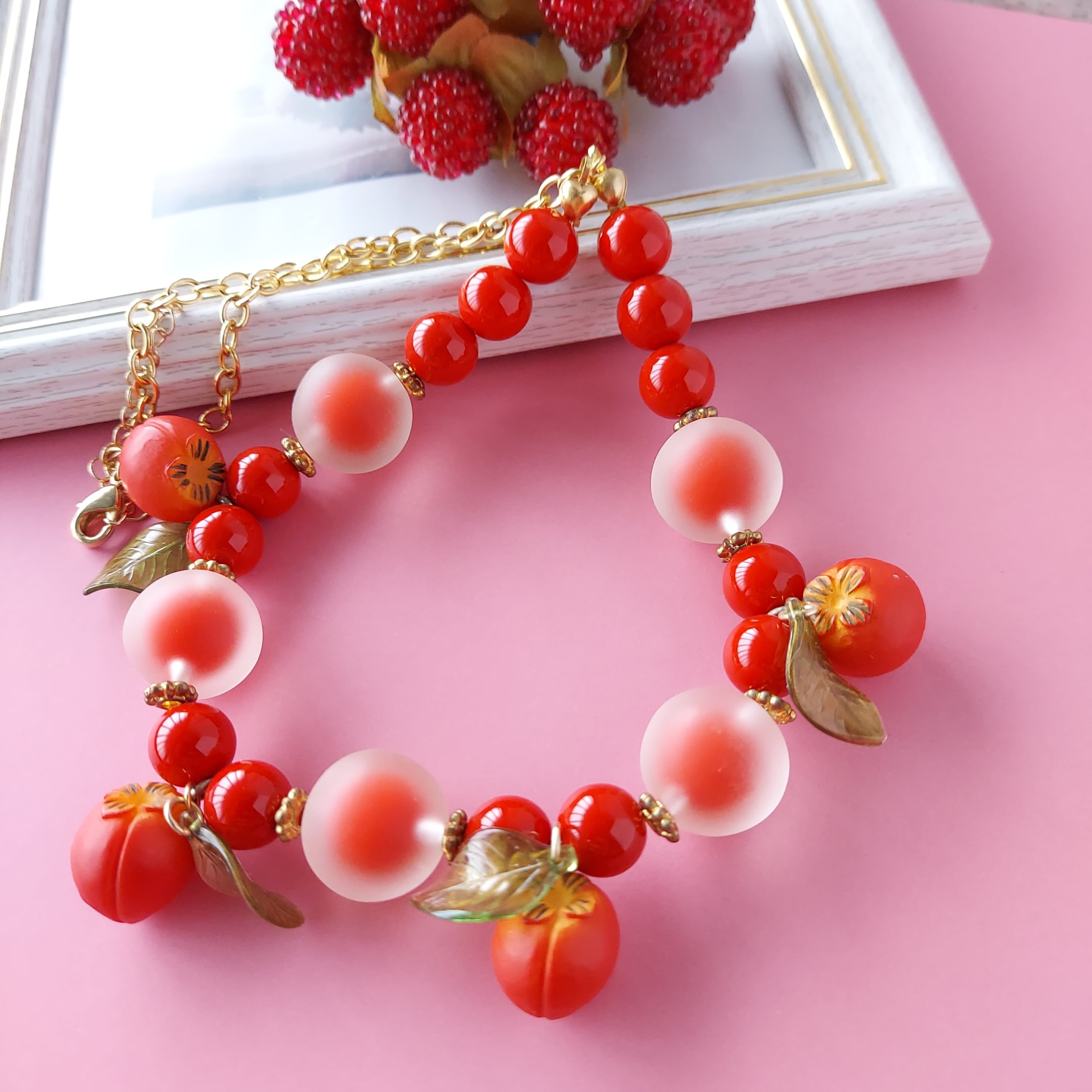 大ぶりなパッションフルーツチャームと鮮やかな赤のビーズが目を引くデザインは、