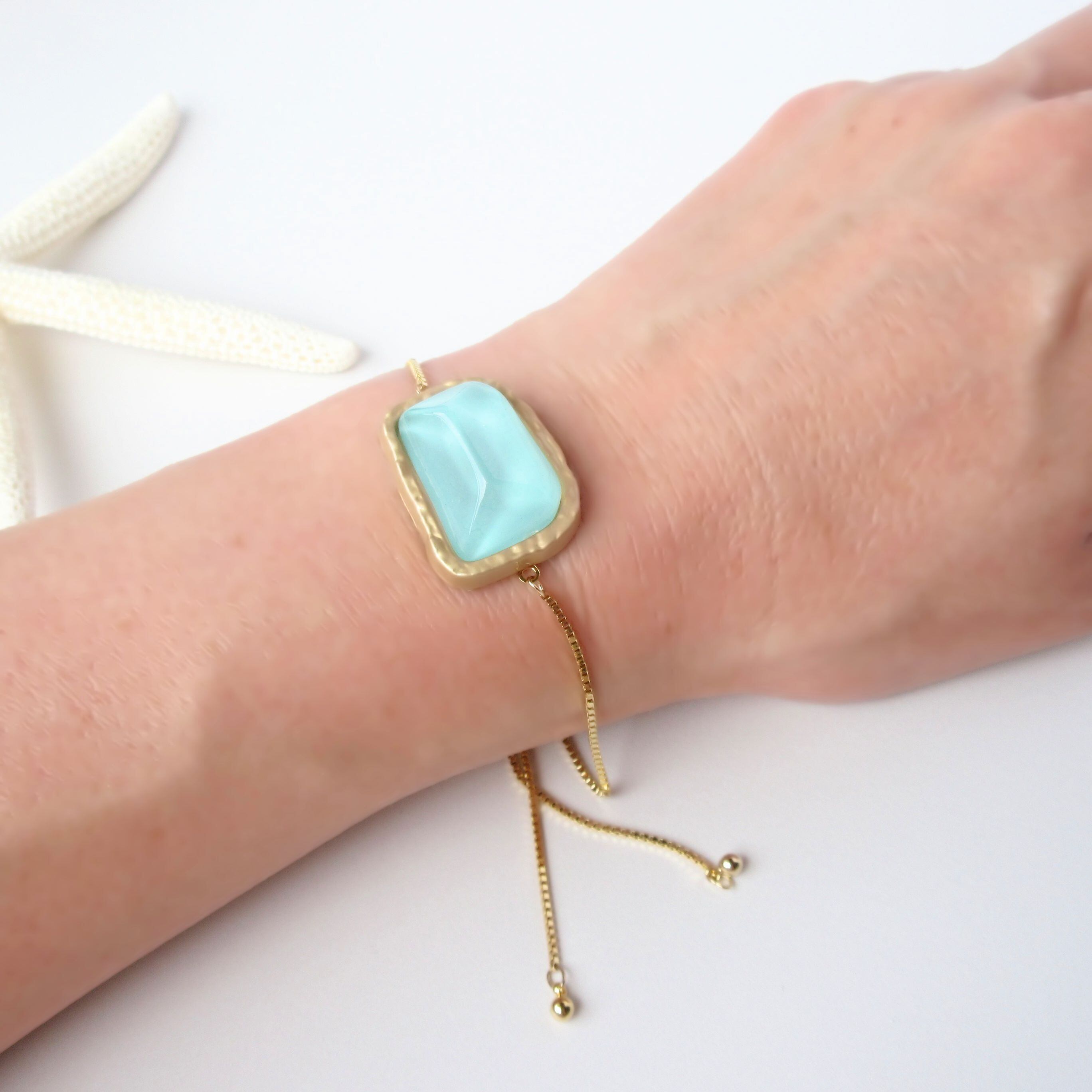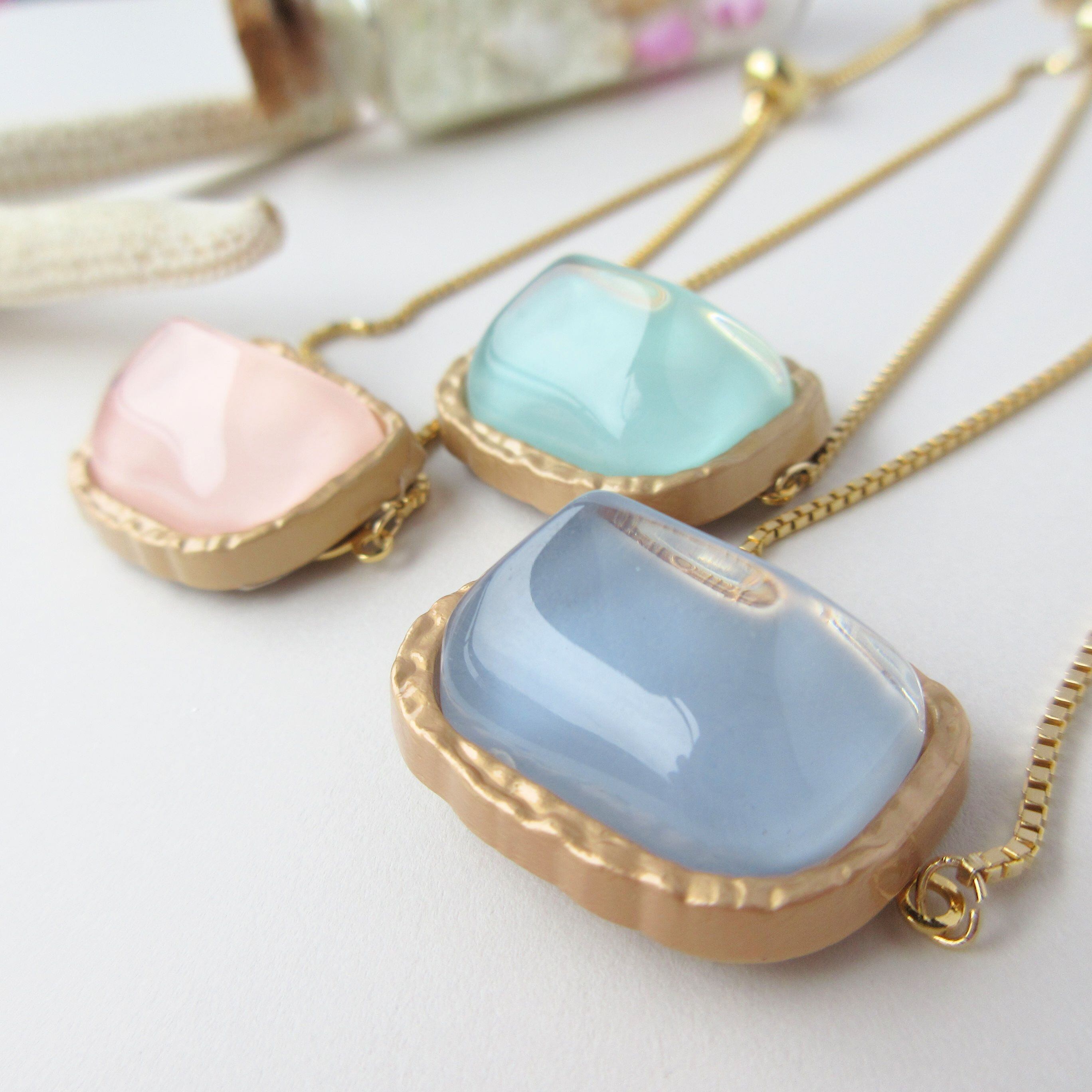 アイスキューブの凹凸デザインが水面のように見える涼し気なボタンをブレスレットにしました。約25㎜×20㎜大の存在感ある大粒ボタンを一粒だけチェーンに着けました。