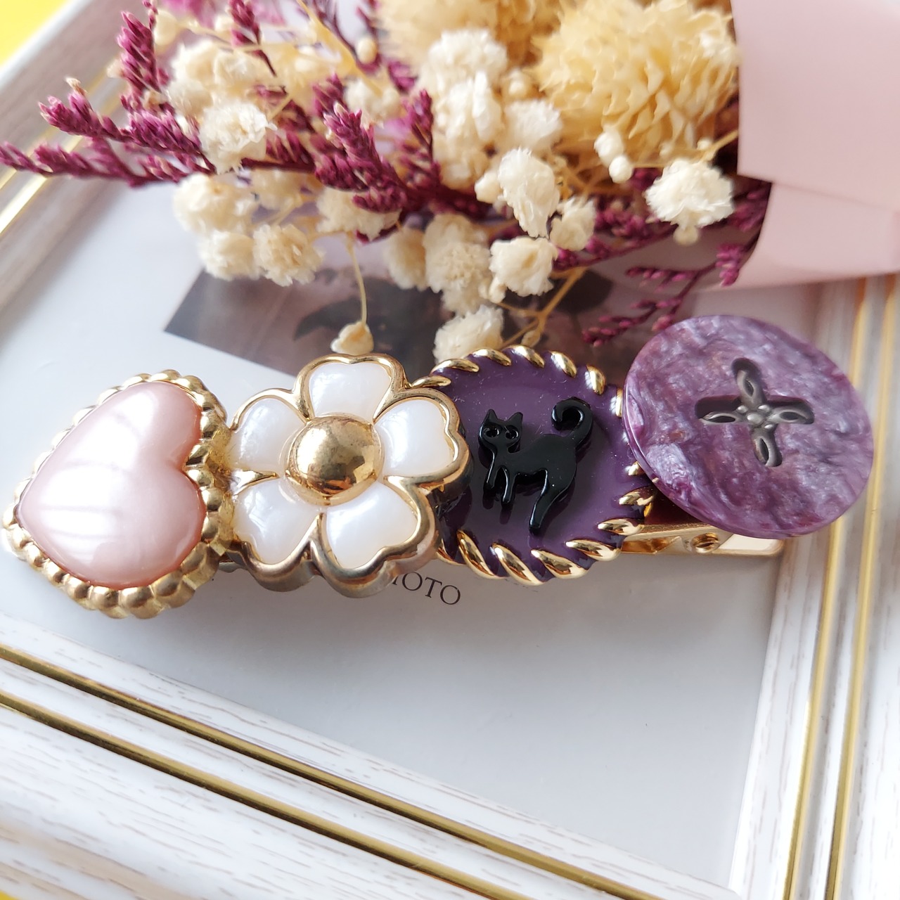 ハンドメイドで作られた4連ボタンを組み合わせたヘアクリップは、一つ一つ異なるデザインが魅力です。シンプルながらも存在感のあるアイテムは、ヘアアクセサリーとしてだけでなく、ファッションアイテムとしてもお使いいただけます。
