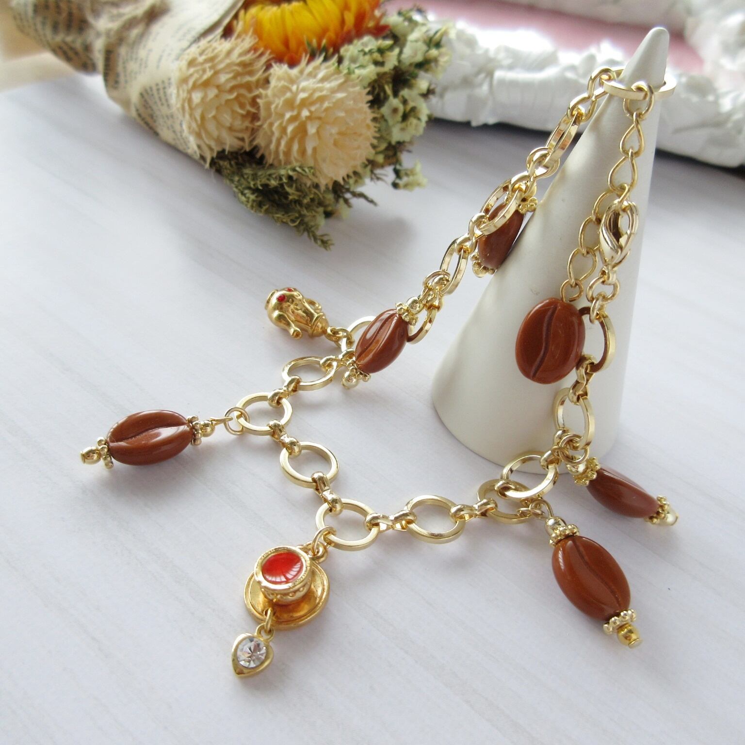 コーヒー豆形の可愛すぎるビーズ、ミニポットとミニコーヒーカップをゆらゆらさせたチェーンブレスレット。