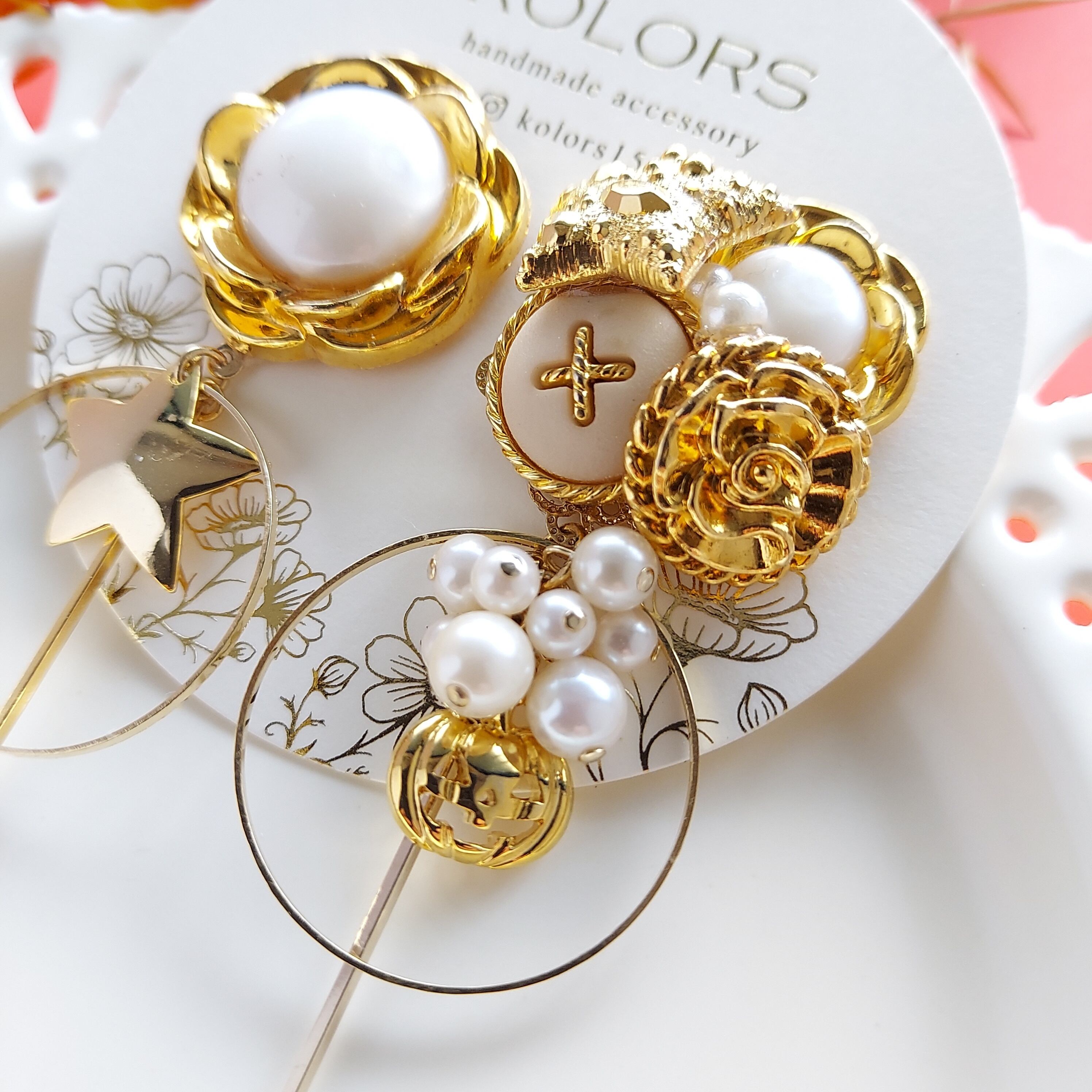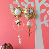 大振りで存在感のある大きなパールボタンとホワイト系ボタンとハロウィンカボチャのピアス・イヤリング。特別なイベントやパーティーにぴったりのアクセサリーです。ハロウィンの季節には特に人気が高まります。華やかで個性的なデザインなので、コーディネートのポイントとしてもおすすめです。また、ピアスポスト部分とイヤリング部分はサージカルステンレスで作られているため、アレルギーや肌荒れの心配もありません。軽く揺れるデザインが女性らしい印象を与え、ハロウィンの楽しい雰囲気を存分に演出します。是非、このボタンとカボチャのピアス・イヤリングでおしゃれを楽しんでください。