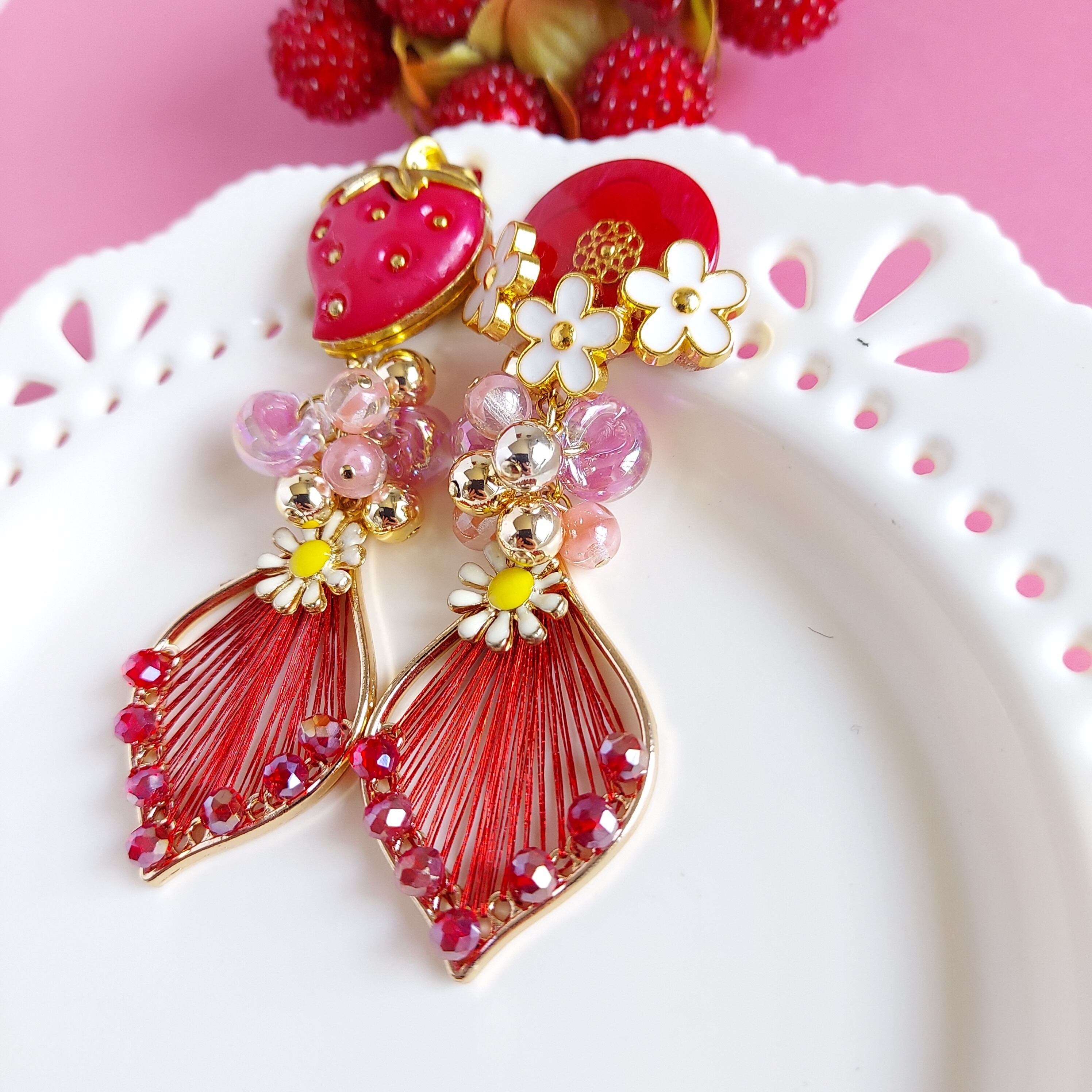 ユニークで遊び心溢れる「苺とお花の揺れるピアス/イヤリング」は、耳元に優雅で甘酸っぱい魅力を添える特別なアイテムです。アシメトリーなデザインが魅力的なこのアイテムは、苺ボタンとそれに似合う赤のボタン、そしてお花のボタンを組み合わせ、立体的かつカラフルな表情を楽しませてくれます。