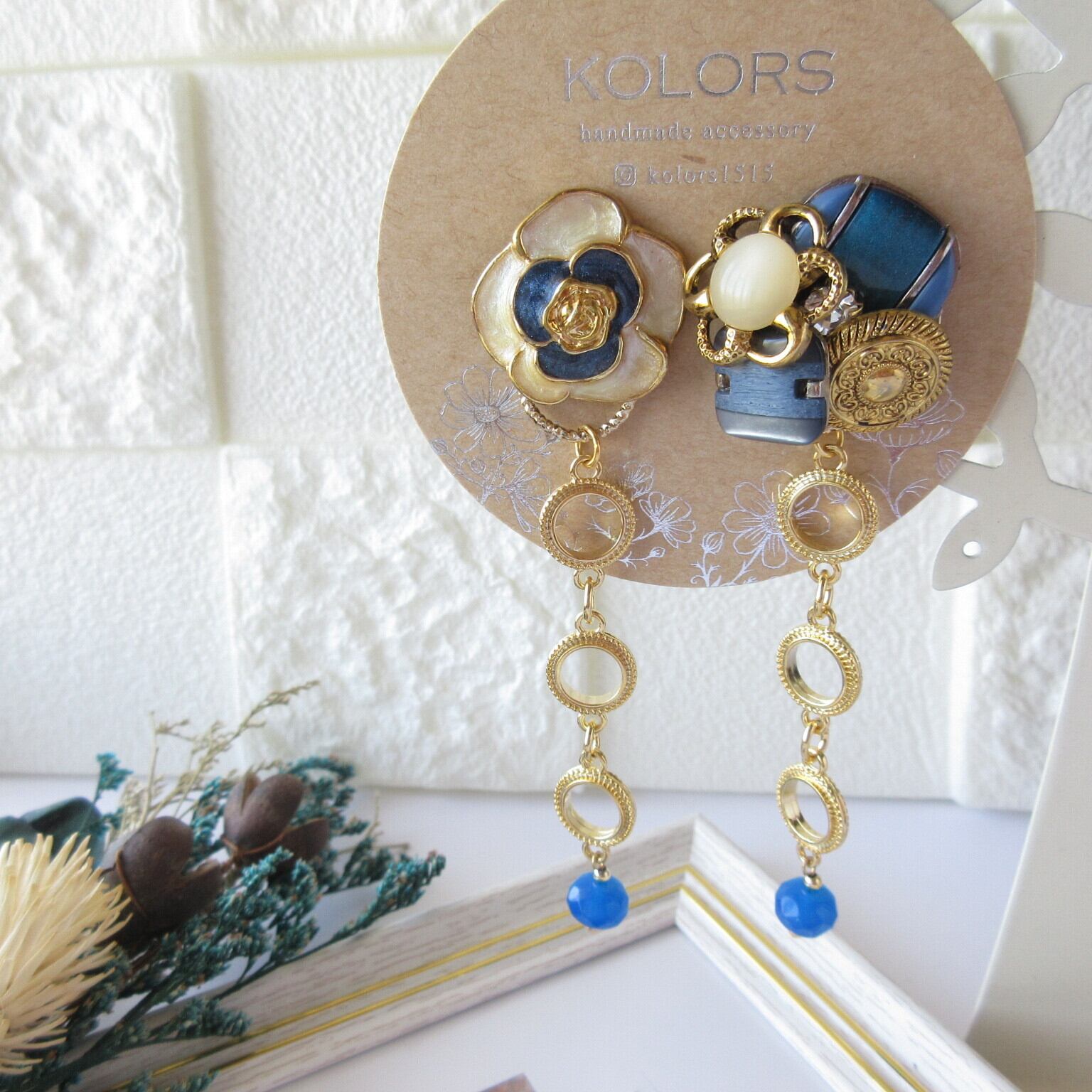【ブルーフラワーボタンロングピアス・イヤリング】