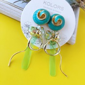 鮮明なグリーンのアンモナイト型ボタンが特徴のピアス・イヤリングです。ボタンの下には美しいグリーンのガラスビーズとチェコビーズ、夏を思わせるグリーンのビニールパーツが揺れ動きます。揺れるデザインと大きめのサイズが、洗練された華やかさを加えます。マリンスタイルのアクセサリーとしてだけでなく、カジュアルな装いにも最適です。また、アレルギー対応のサージカルステンレスを使用しているため、安心してお使いいただけます。洗練されたデザインと高品質が、あなたを一層輝かせるでしょう。