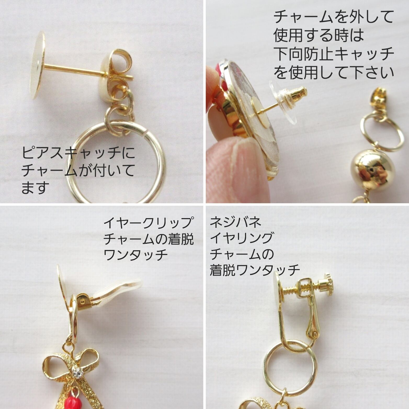 他のピアス・イヤリングのチャームと付け替えてオリジナルのオシャレも楽しめまるのでオシャレの幅が広がる仕様です。