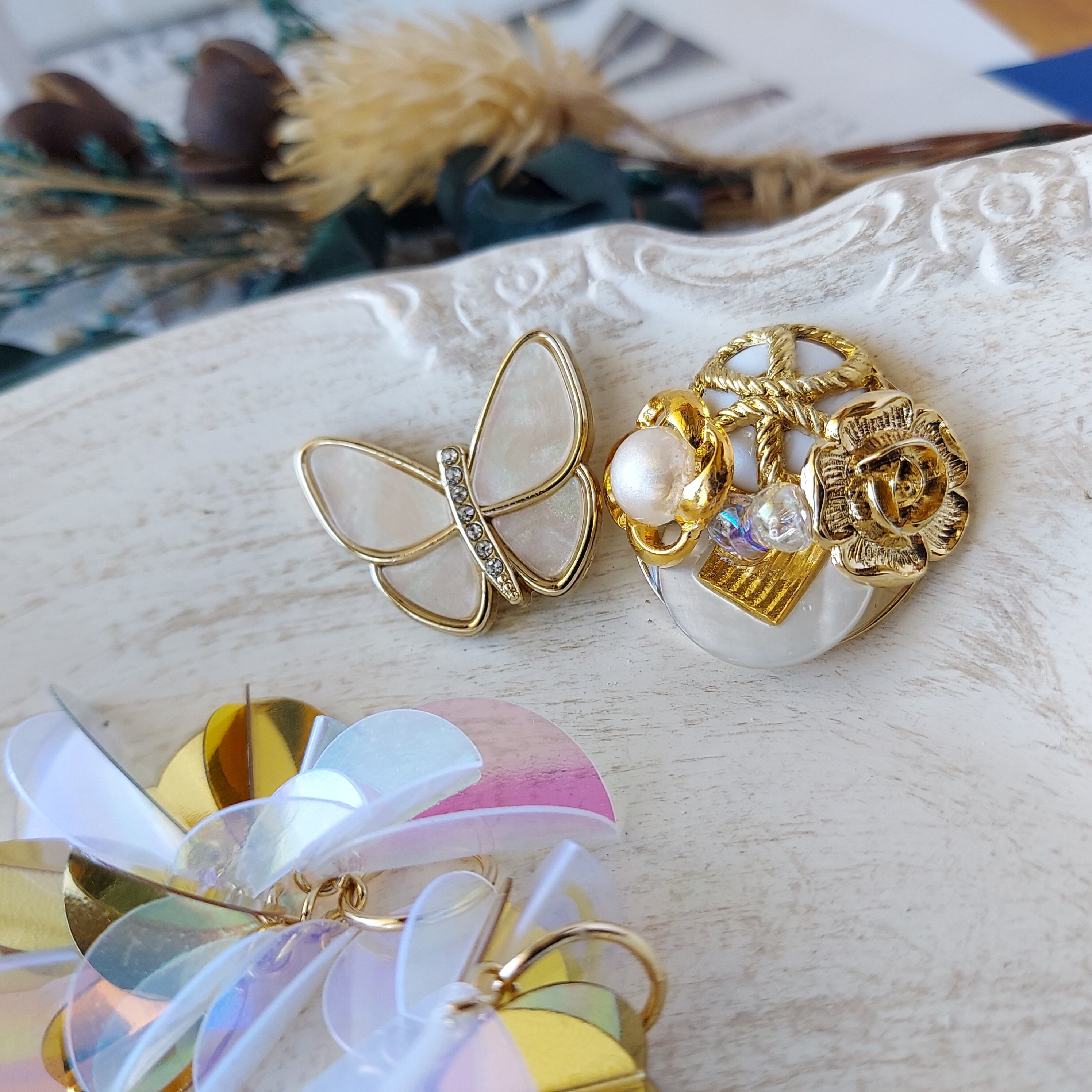 ぜひ、あなたのファッションに彩りを添えるこのホワイト蝶とスパンコールのイヤリングを手に入れてみませんか?