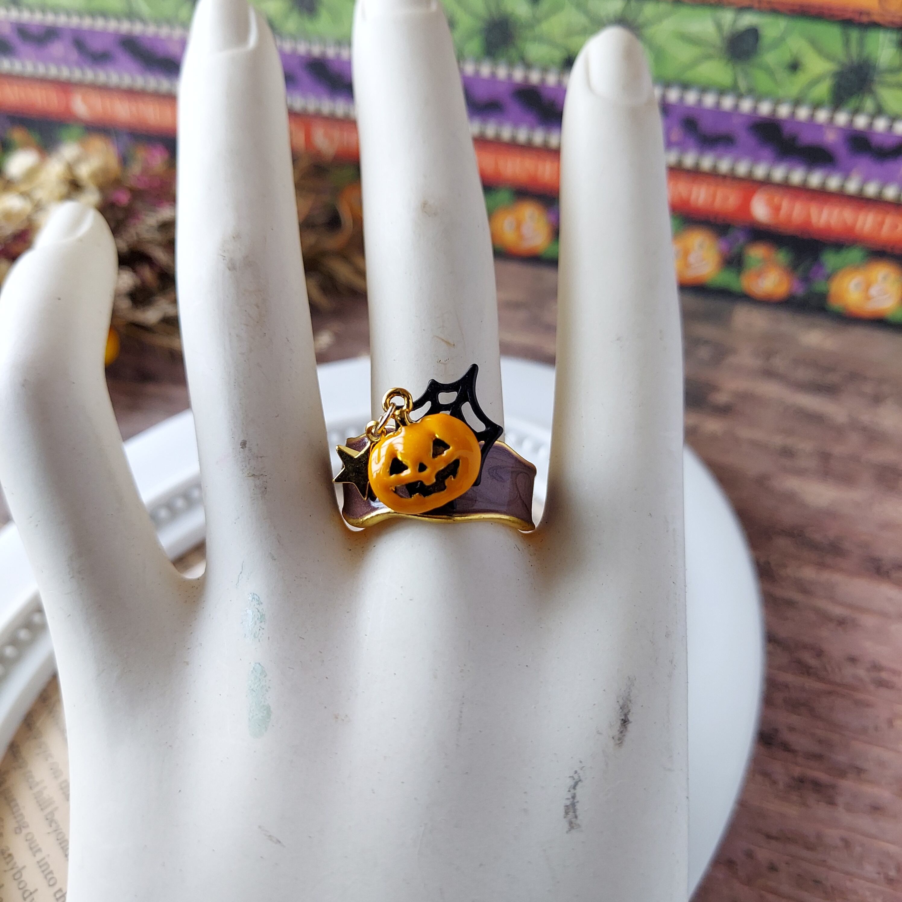 ハロウィンシーズンにぴったりな、かわいらしいハロウィンカボチャリングです。紫色のリングにカボチャチャームと蜘蛛の巣チャームがアクセントになり、指先を華やかに演出します。ハンドメイドで作られた特別な一点ものであり、他の人と被らない個性的なアクセサリーとしてお使いいただけます。