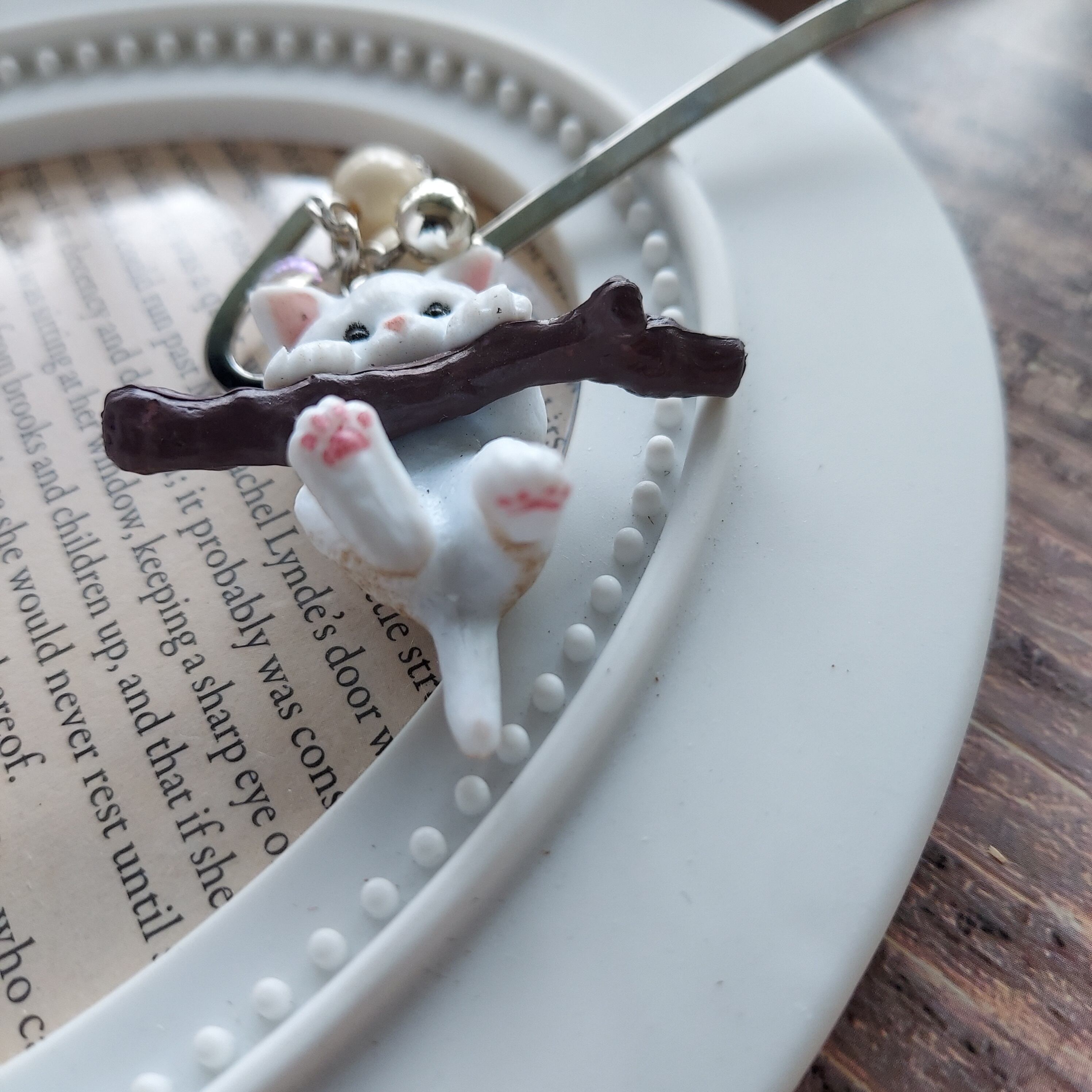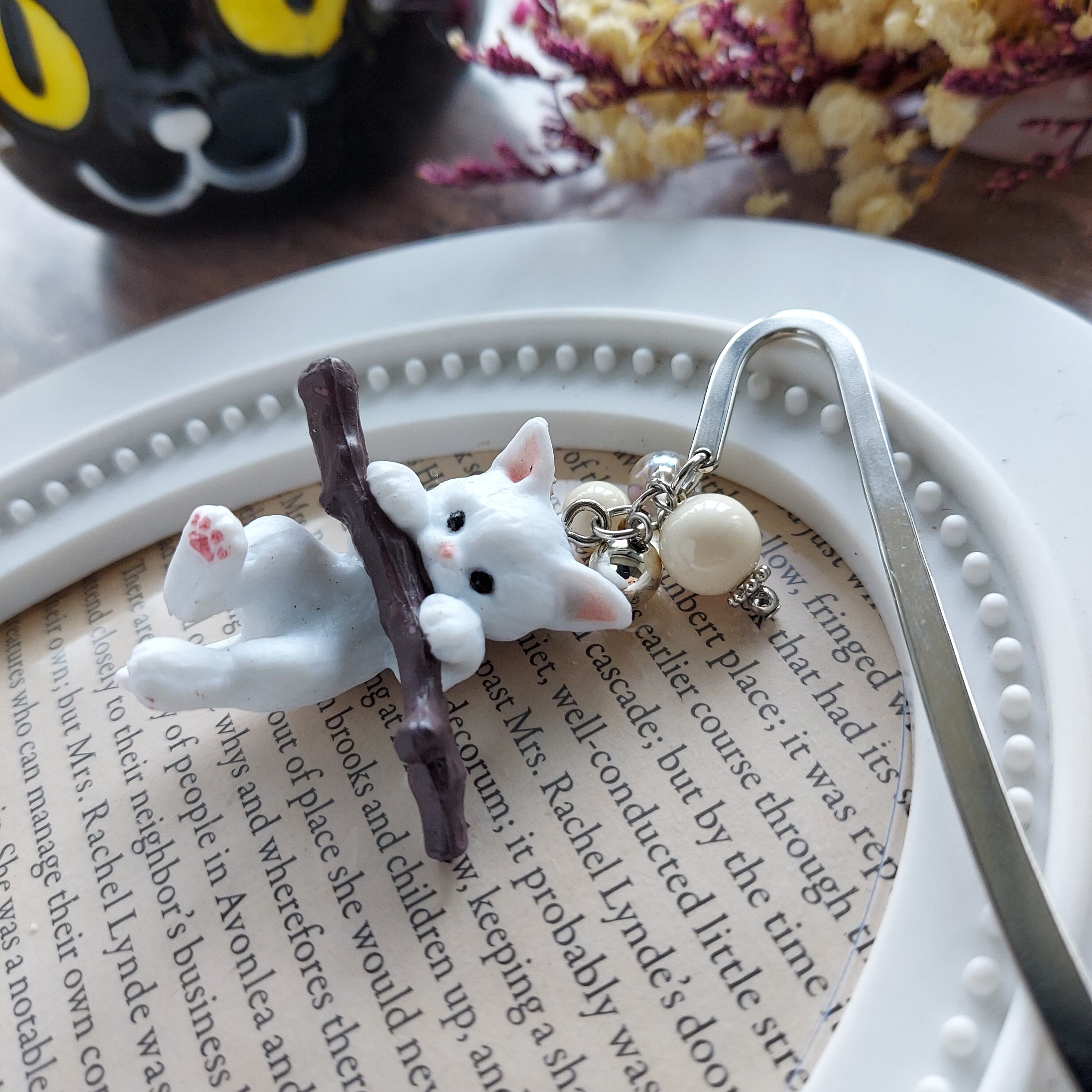 木登りをしているやんちゃで可愛らしい猫のチャームが揺れる、ハンドメイドのブックマーカーです。本を読むのが好きな方にオススメのアイテムですよ!