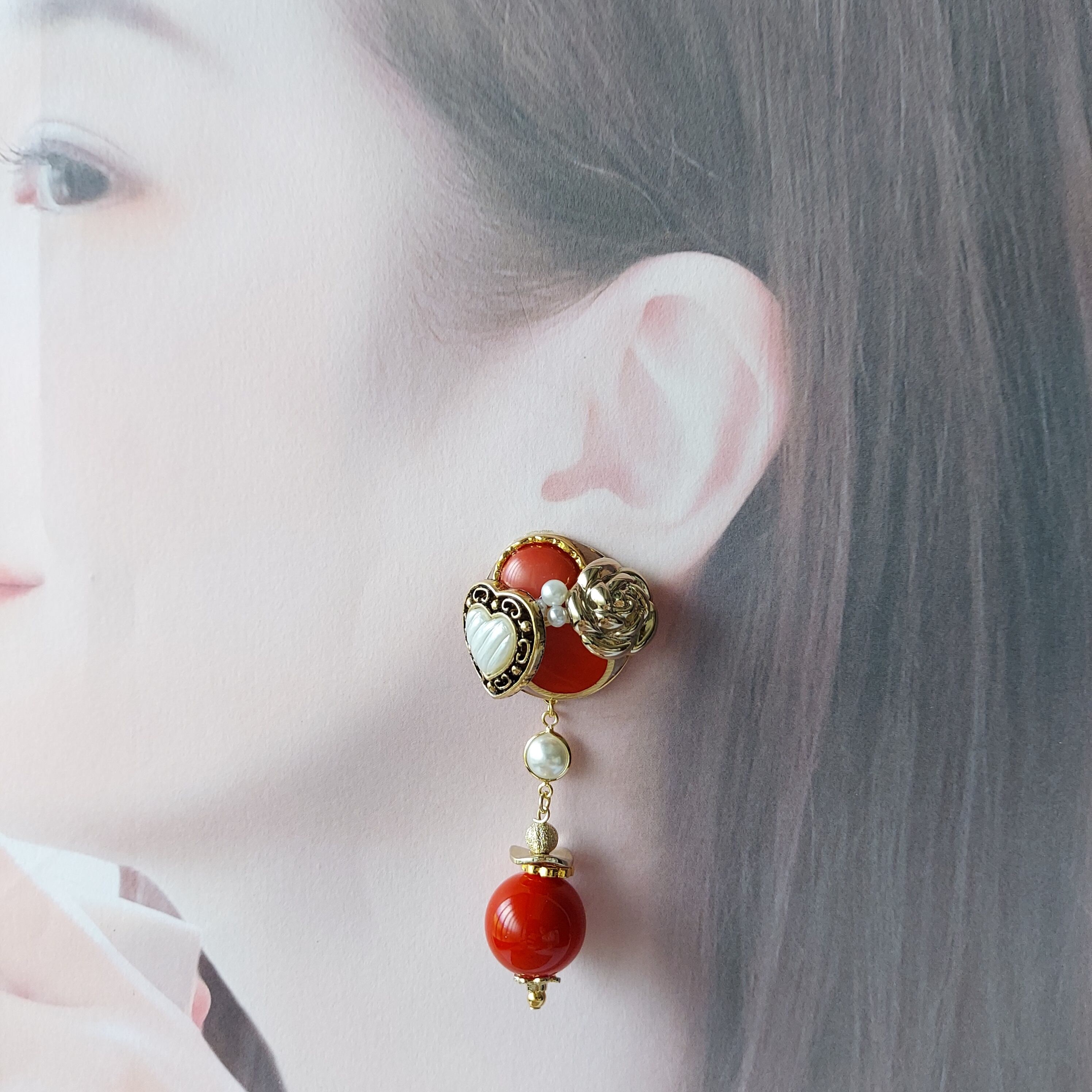 苺ボタンの下に真っ赤なビーズがユラユラ揺れる、可愛いピアス・イヤリングです。