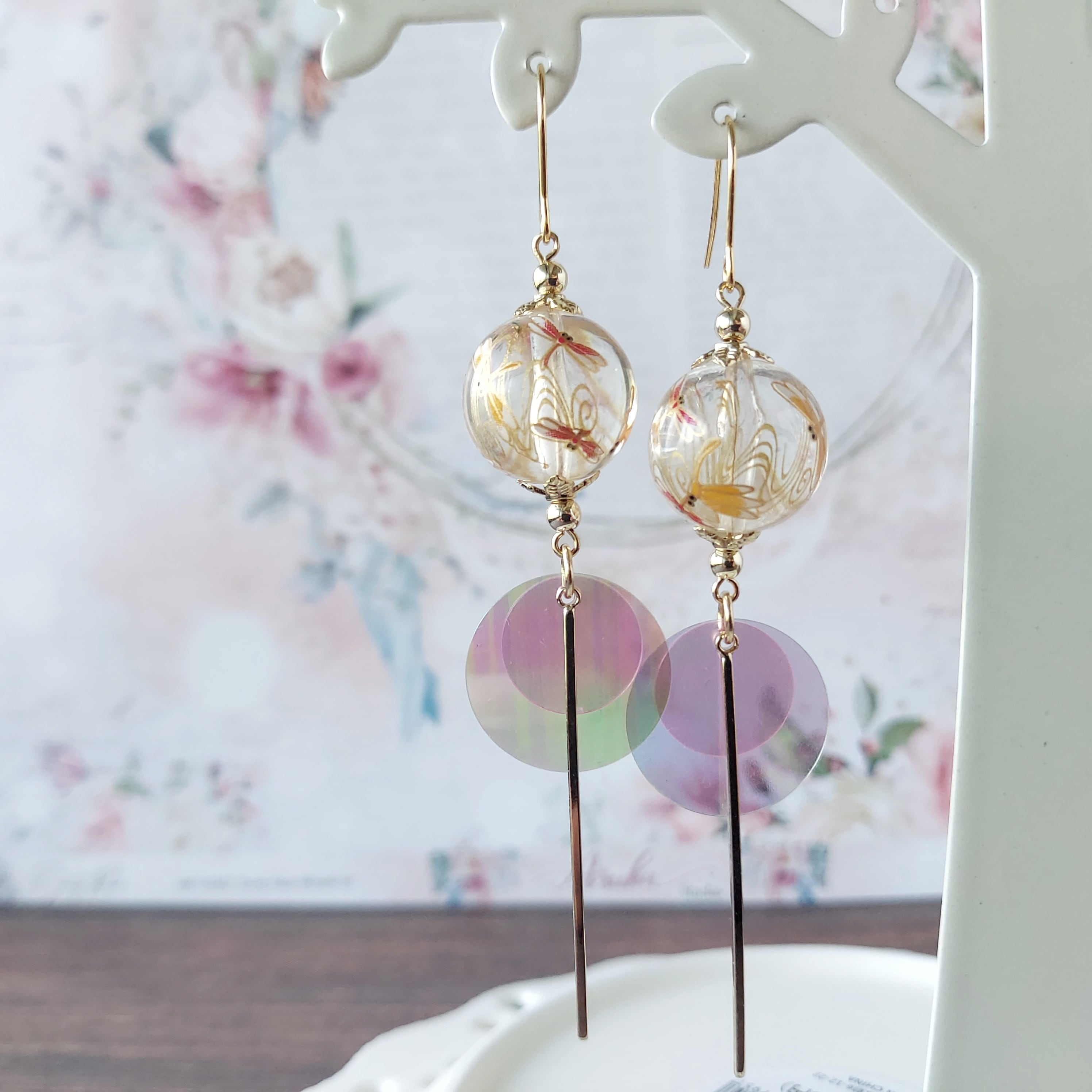 トンボ玉ピアス・イヤリングは、秋の訪れを感じさせる上品なデザインが魅力です。ビーズにトンボ柄が転写され、その下にはキラキラと輝くメタルバーとスパンコールが揺れるエレガントなアクセサリー。さりげないが存在感のあるデザインで、どんなシーンにもマッチします。