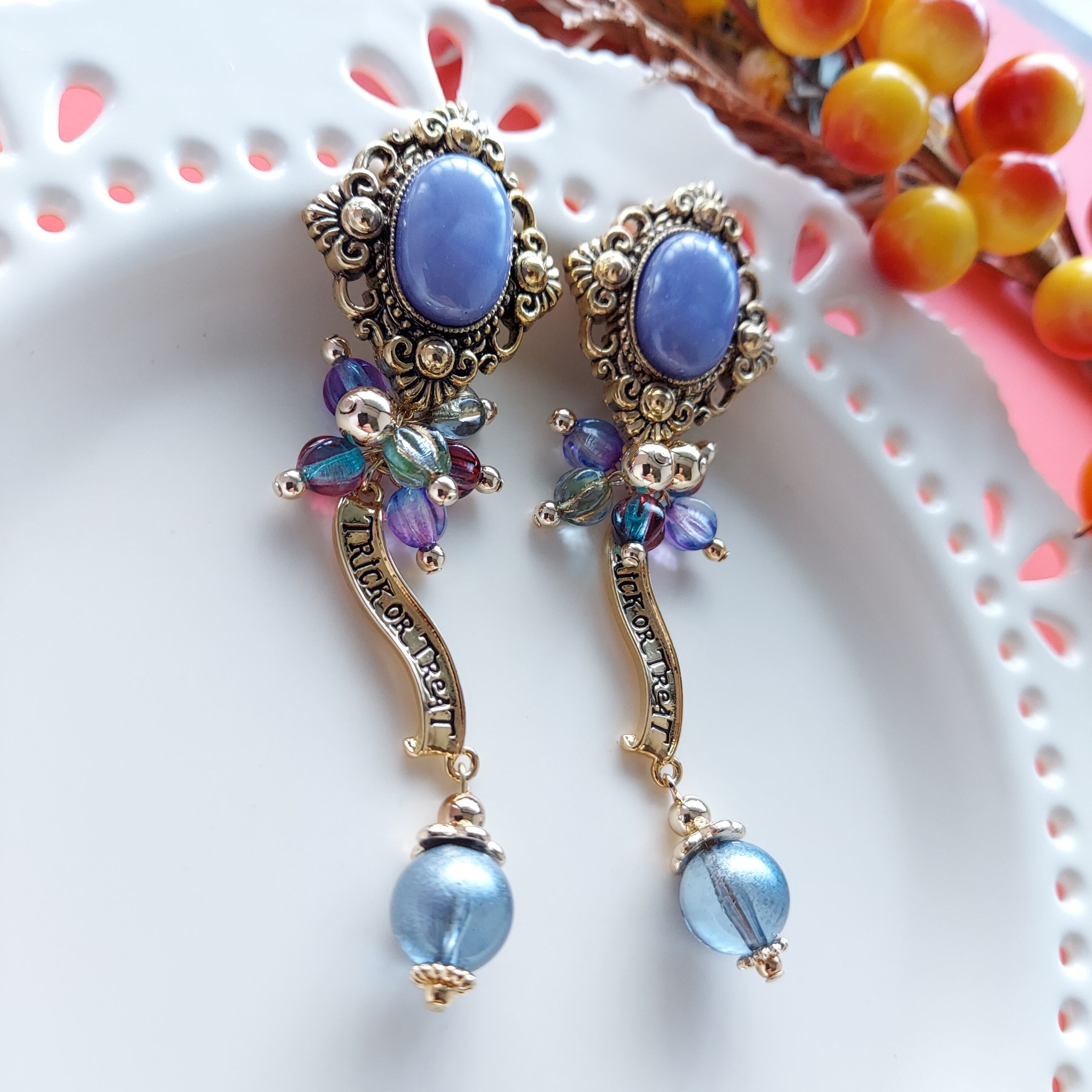 エレガントな印象とハロウィンの楽しさを兼ね備えた、パープルボタン エレガント ハロウィン ピアスイヤリング。パープルカラーのボタンの下には可愛いハロウィンチャームが揺れるデザインで、周囲をアクセントで飾り立てます。さらに、パープルのチェコビーズが煌めきをプラスし、女性らしさを引き立てます。