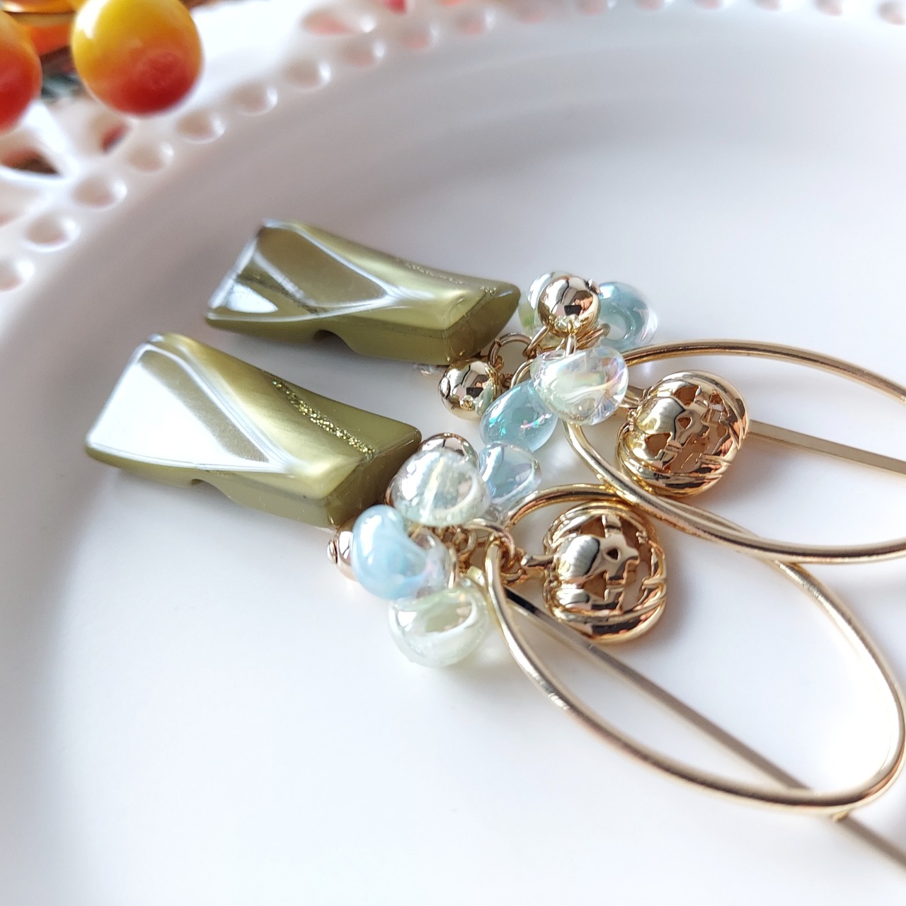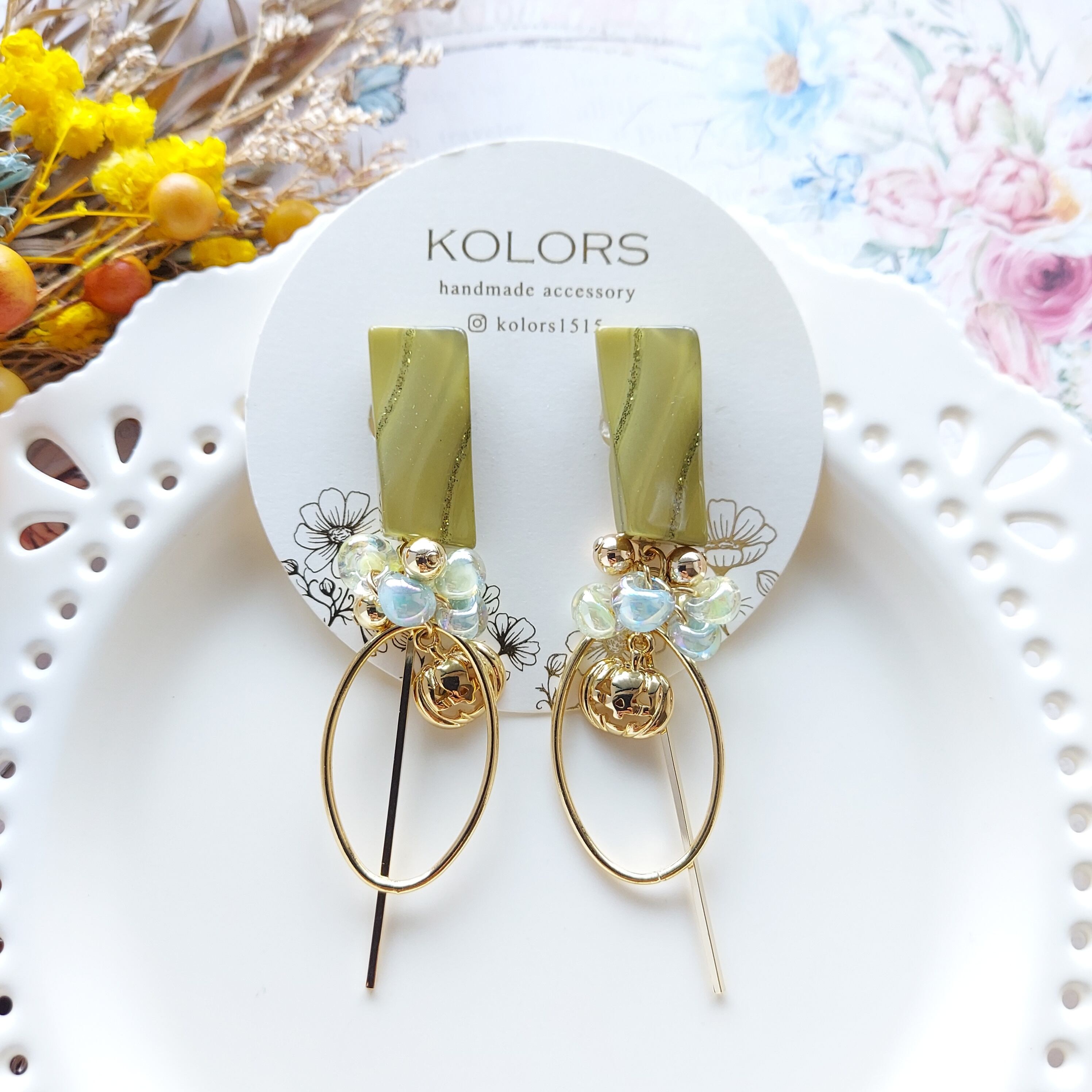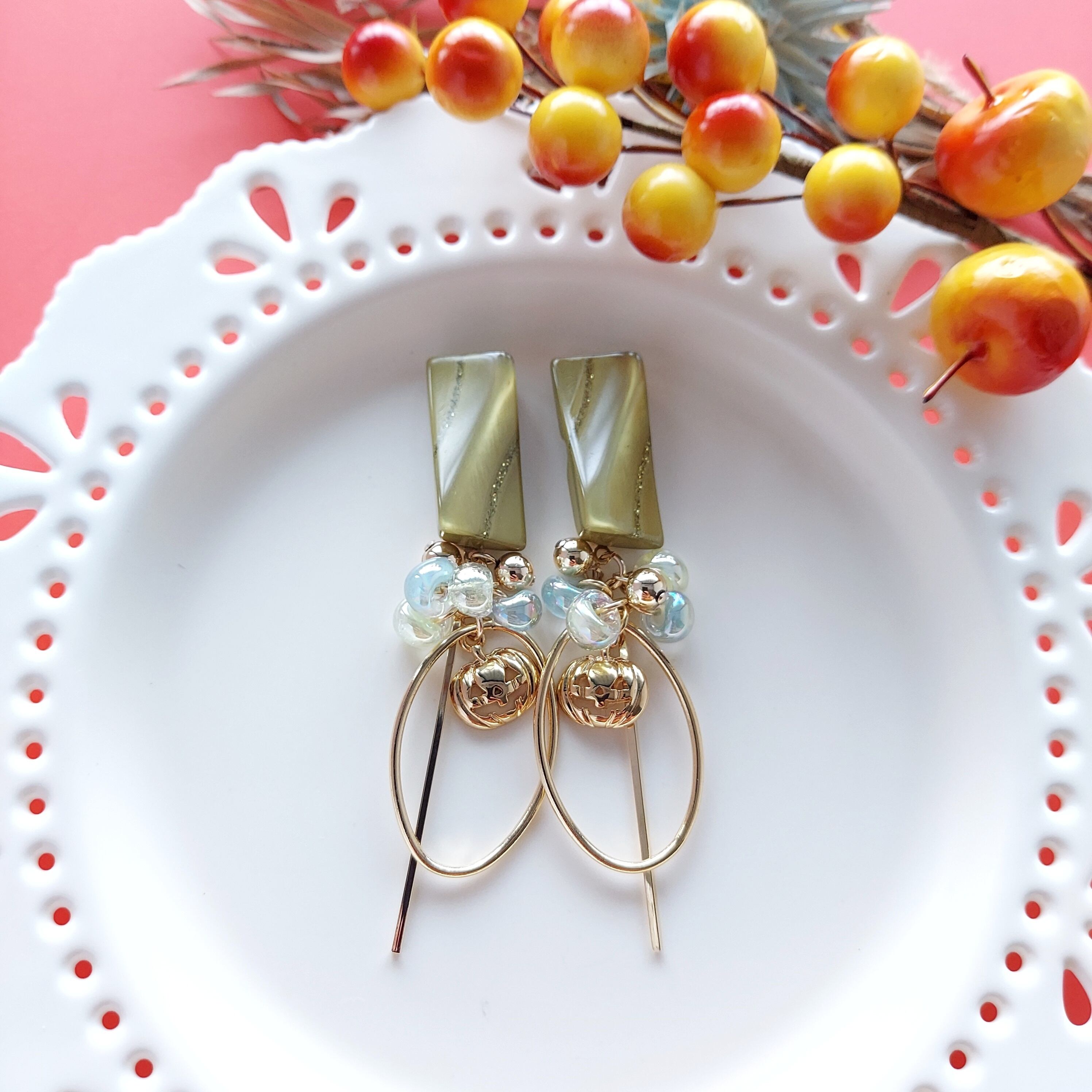 ボタンの下には綺麗なグリーン系のガラスドロップビーズ、ハロウィンカボチャが揺れるデザインで女性らしさを引き立ててくれます。