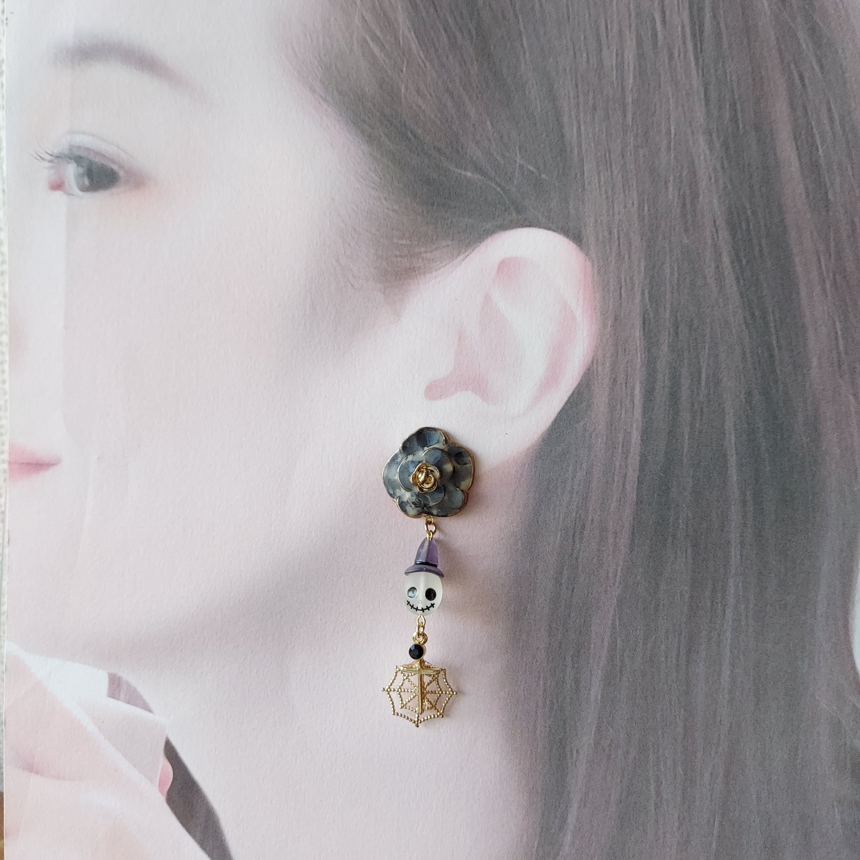 【ハロウィンスカルとフラワーボタン ピアス・イヤリング】
