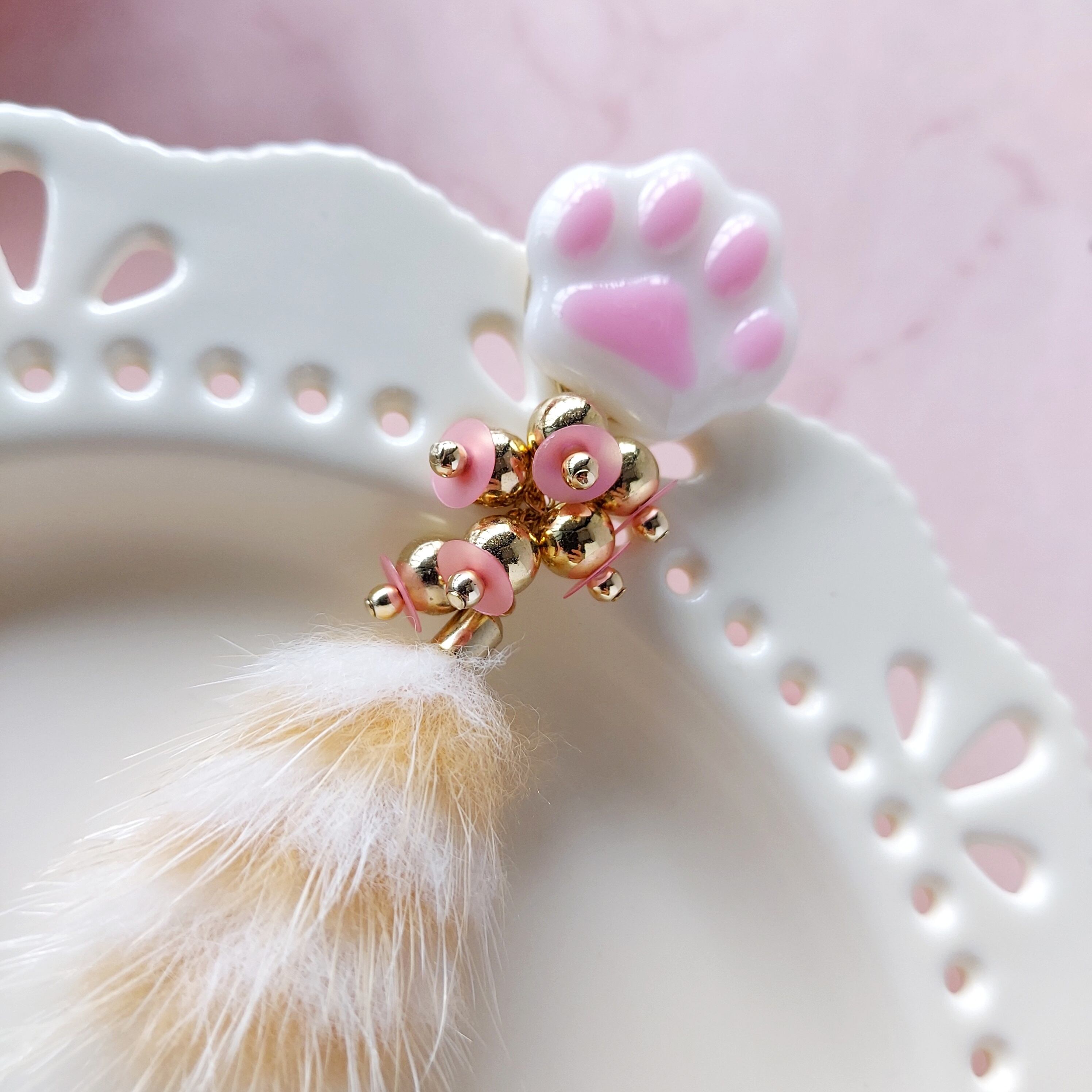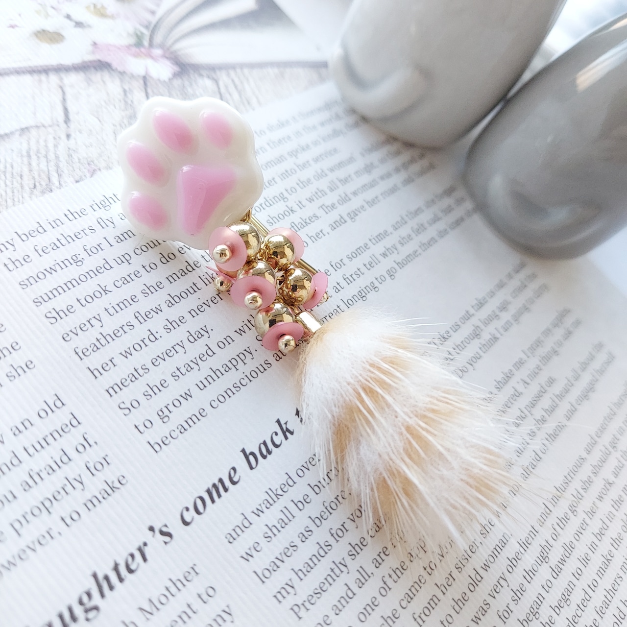 ピンクの肉球の下には、猫の尻尾を連想させるオレンジ色のファーが優雅に揺れ、軽やかな春の風を感じさせます。